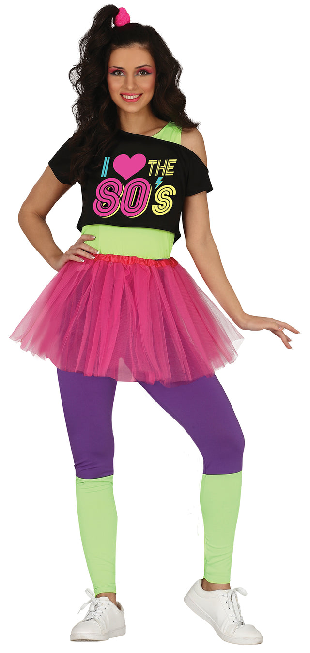 Ce costume complet est conçu pour assurer à la fois un look authentique des années 80 et un maximum de confort. Fabriqué en polyester résistant, il est léger, agréable à porter et facile à entretenir, ce qui est essentiel pour pouvoir bouger librement et danser toute la nuit. L'ensemble comprend un T-shirt, une jupe, un pantalon et une chasuble, permettant de créer une silhouette audacieuse et reconnaissable, fidèle au style exubérant de l'époque. La combinaison de ces éléments garantit que vous serez la star de la fête.- T-shirt